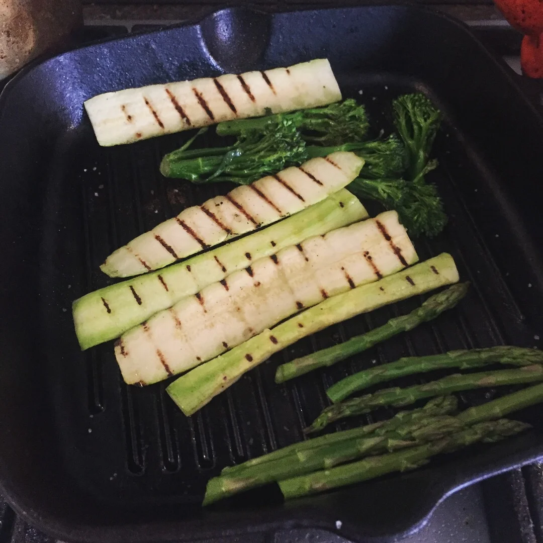 I also love having a great big bowl of veggies, my fave being a bowlful of sweet potato fries served with green beans and tender broccoli cooked on a grill pan with nothing more than a little olive oil and some salt and pepper.