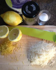 Grate the zest of the lemons and halve one of them so you have it ready to squeeze into the sauce and grate the cheese.