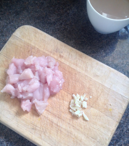 Chop a piece of chicken breast into small pieces and also chop a nice big clove of garlic.