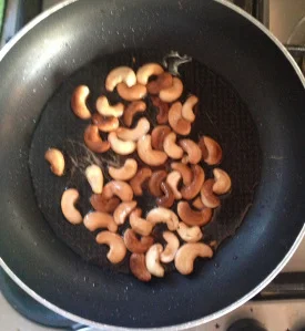 Put quite a bit of oil, about 4 tablespoons, into a frying pan or wok and when hot add the cashew nuts. Fry, stirring, over a medium heat until golden brown - this will take a few minutes. When brown remove from the oil, drain on kitchen paper and set aside.