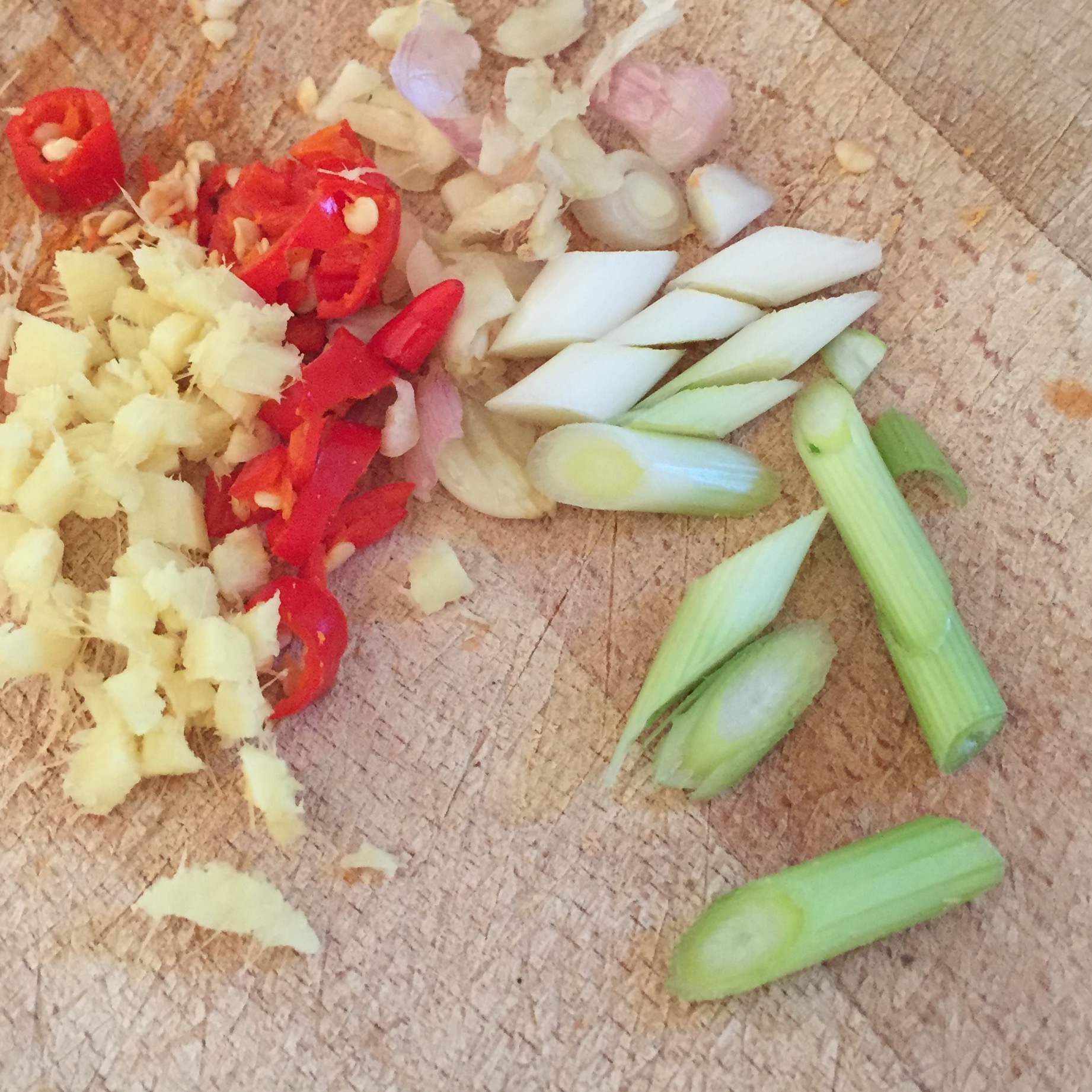 Chop the garlic, chilli, spring onion - cut it on the diagonal for this dish so it looks nice - and ginger. Cut the chicken into very small pieces so that it will cook quickly.