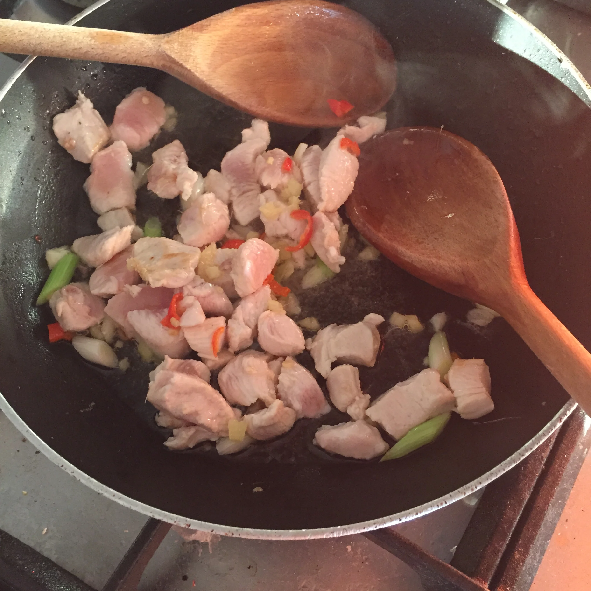 Heat a wok or frying pan over a medium-high heat, add some oil and only when it's hot tip in the chopped garlic, chilli, spring onion, ginger and chicken - it should sizzle when it goes in.