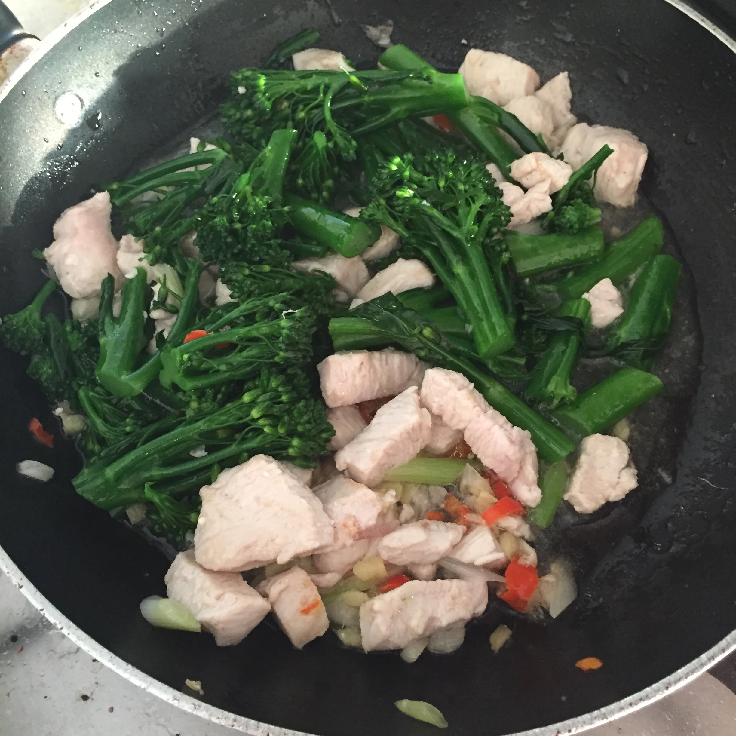After a few minutes, when the chicken's cooked, add the broccoli.