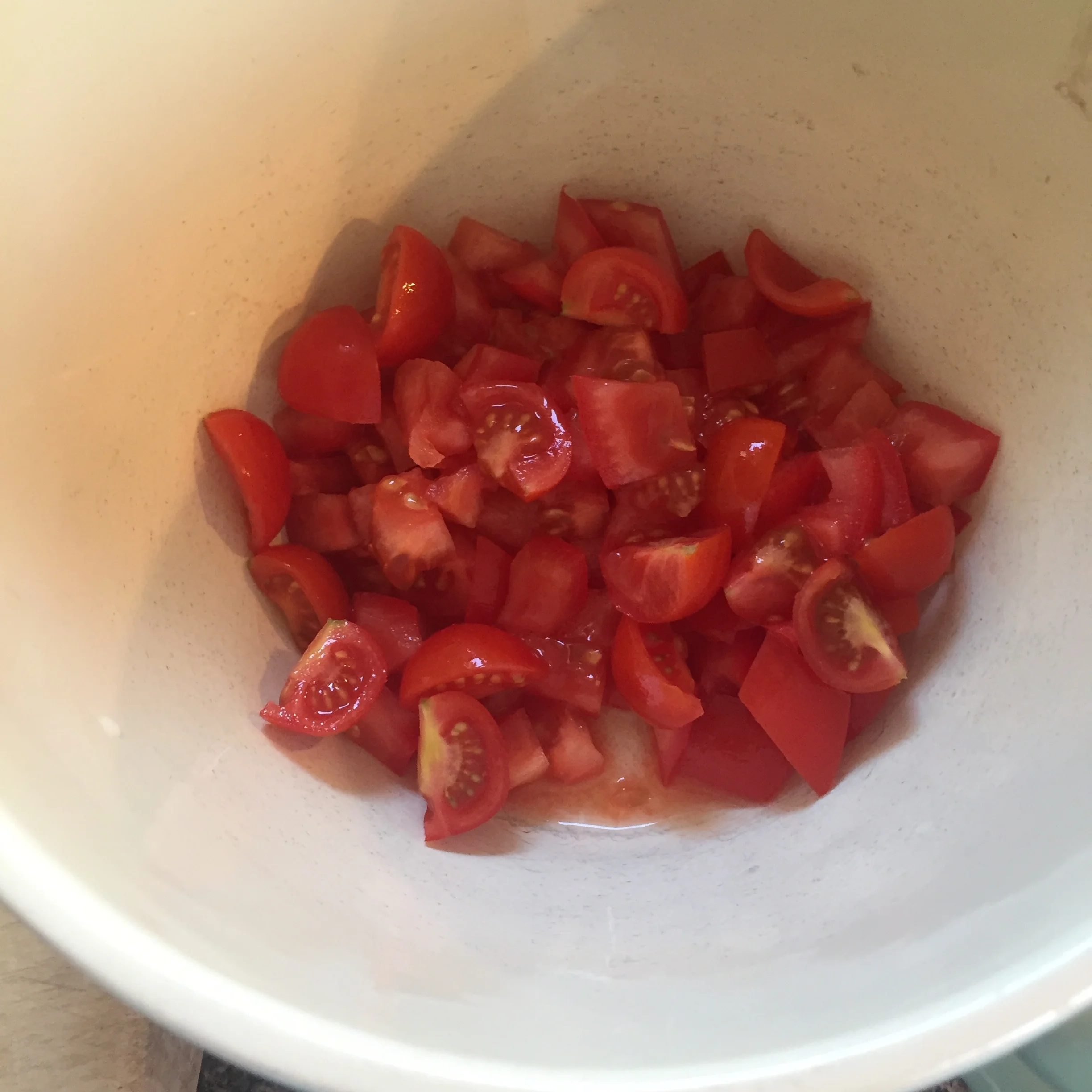 Dice some tomatoes (take the tough cores out if need be). I used a mixture of two large tomatoes and then quartered a few cherry tomatoes too. Peel and de-seed some cucumber and dice that too.