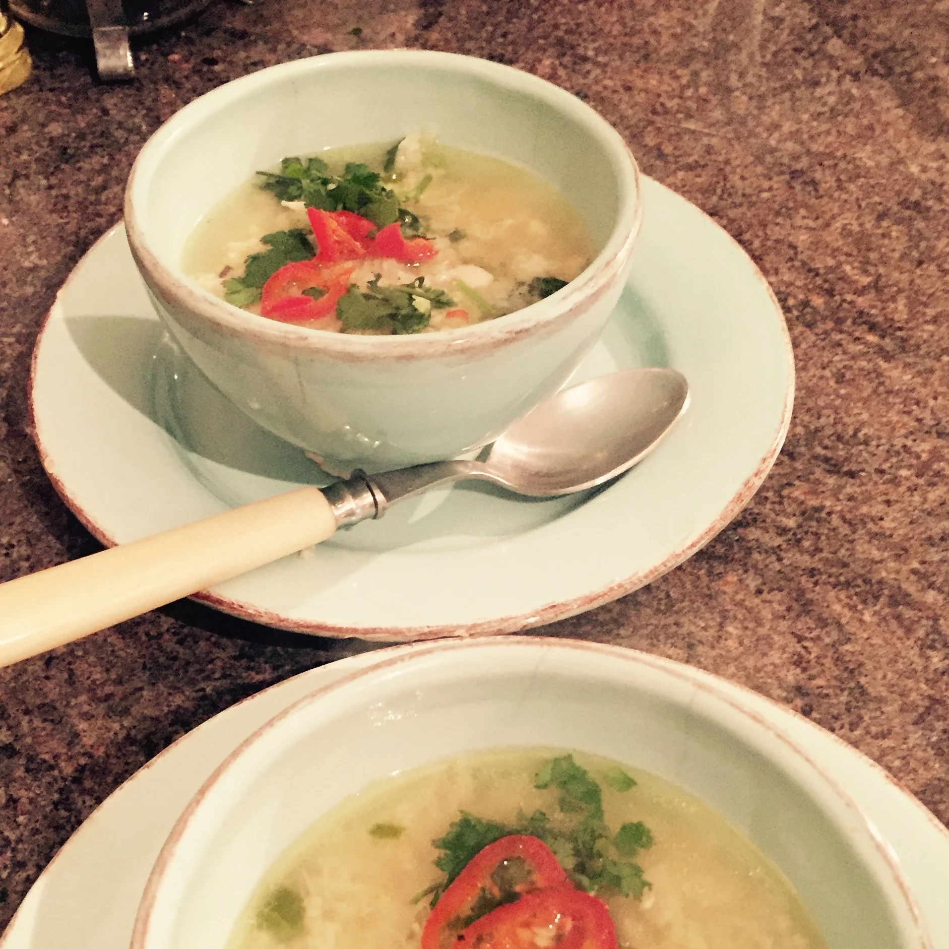 I cracked an egg into a bowl and ladled the boiling soup on top, which on stirring, lightly cooked the egg. I added coriander leaves and some sliced chilli and that was that.