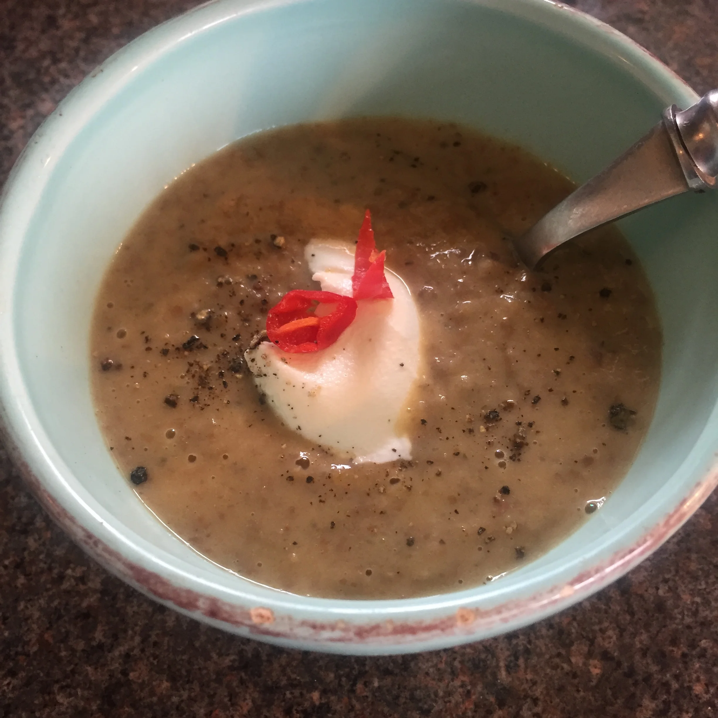 Garnish with whatever you choose! I had another dollop of Greek yogurt, a couple of slices of red chilli and a sprinkling of freshly ground black pepper.