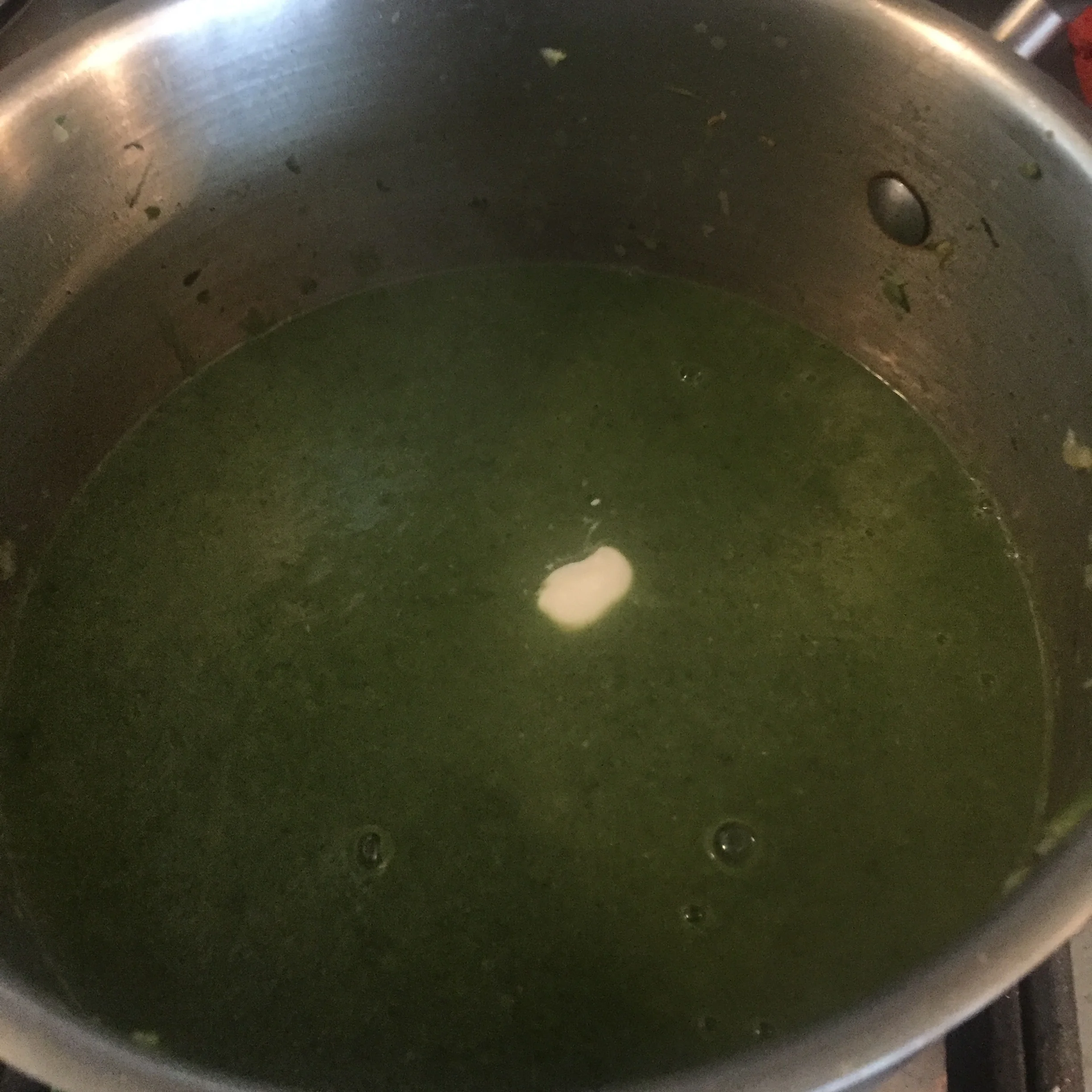 Throw in the spinach leaves and stir until wilted, then add as much water as you want to make your soup plus a tablespoon of natural or Greek yogurt (if using).