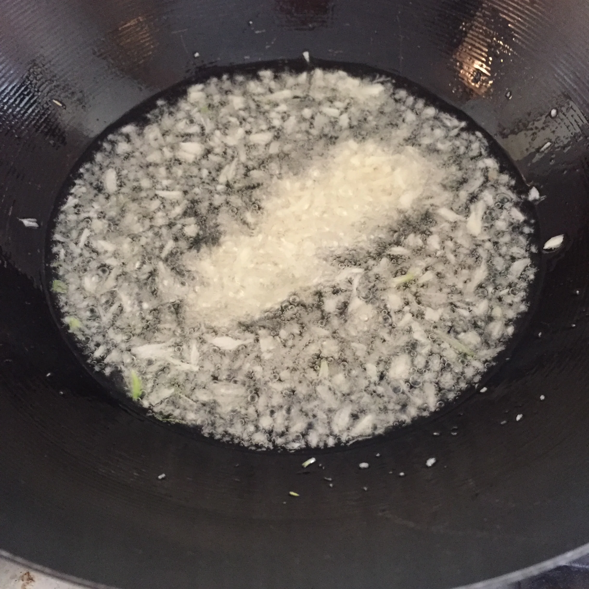 Keep stirring the garlic in the oil over a low heat and after about a minute you'll see the oil begin to sizzle.