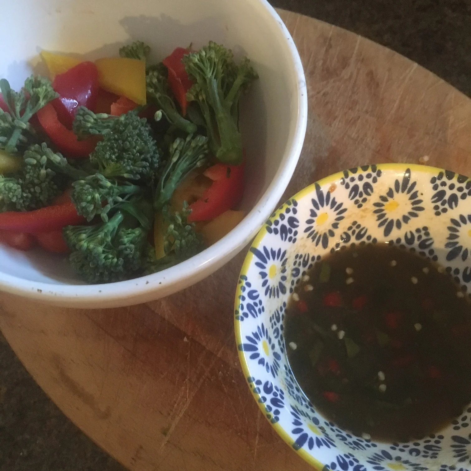 Now just chop the vegetables and we want them in quite small pieces so they'll cook quickly, and also mix also the sauce ingredients (marked in the list above with an '*') in a bowl so it's ready to add.