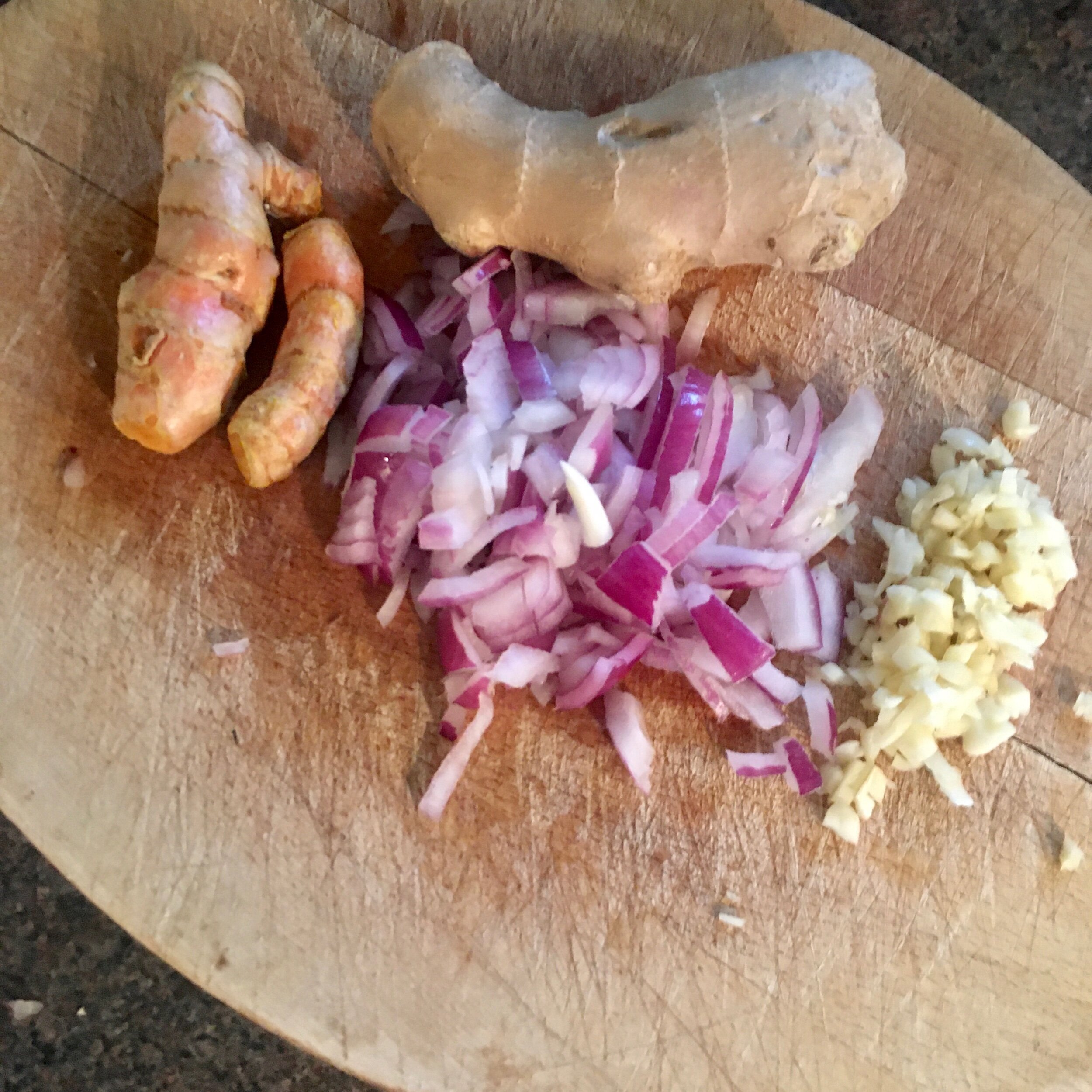 A good piece of turmeric root, peeled and grated (peel by scraping off the skin with a spoon otherwise you’ll lose loads of the flesh if you use a peeler)