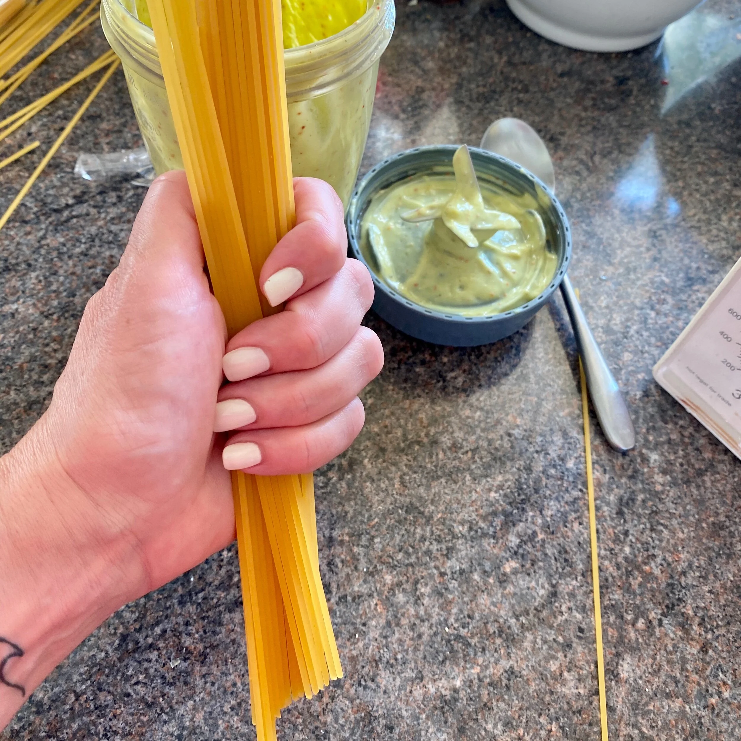 Blend the sauce ingredients first so that’s ready to go and then cook your spaghetti in a big pan of salted water.