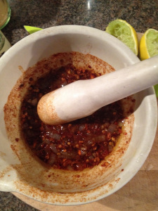 Put the chillies and garlic into a mortar and pound with the pestle to muddle and mush them somewhat together.