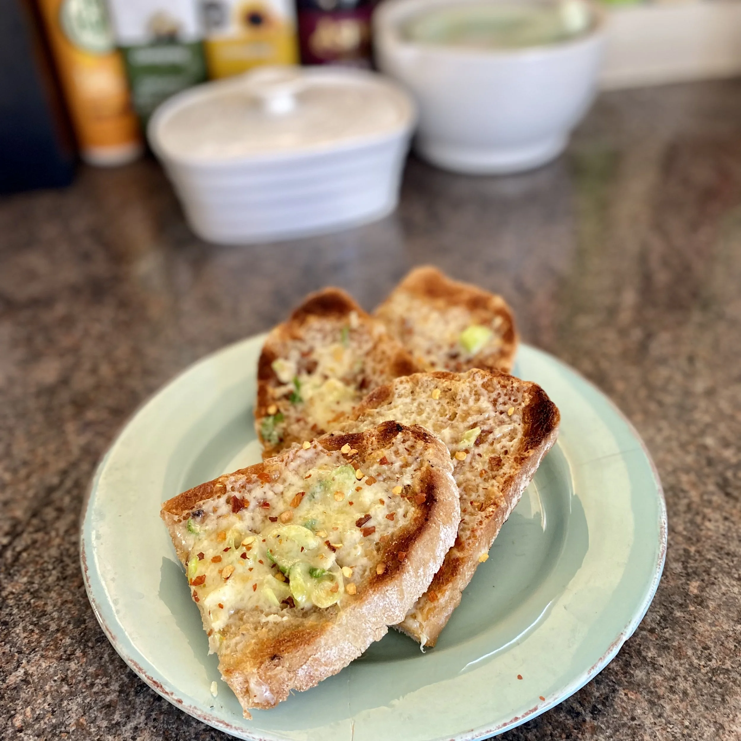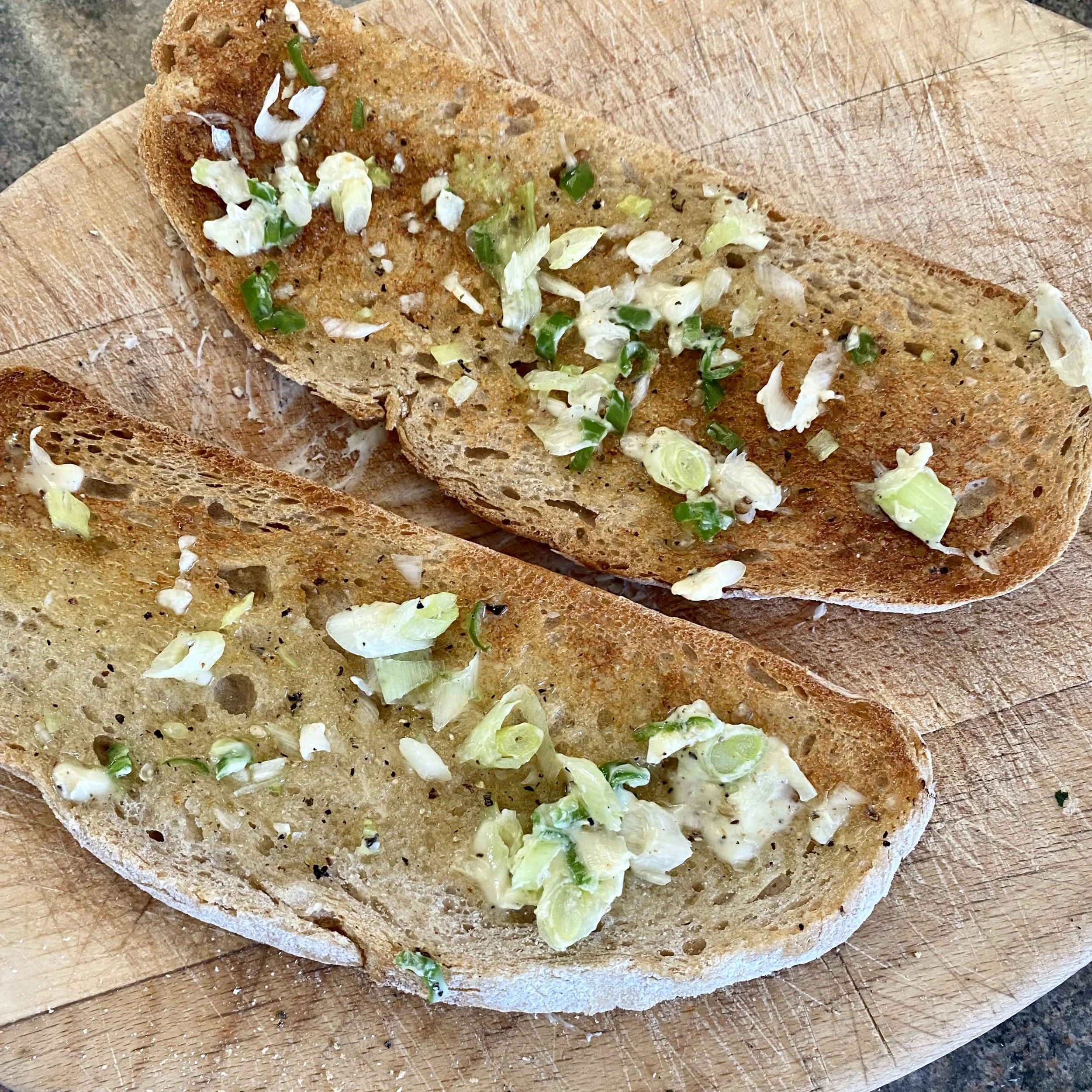 2 slices of bread - or however much you want really. I’ve got two slices of the sourdough they do already sliced at the supermarket. If I’d bought a fresh small springy loaf from my favourite local shop I’d probably have four slices so … y’know - all up to you, your hunger or greed, and the size of the loaf. You decide.