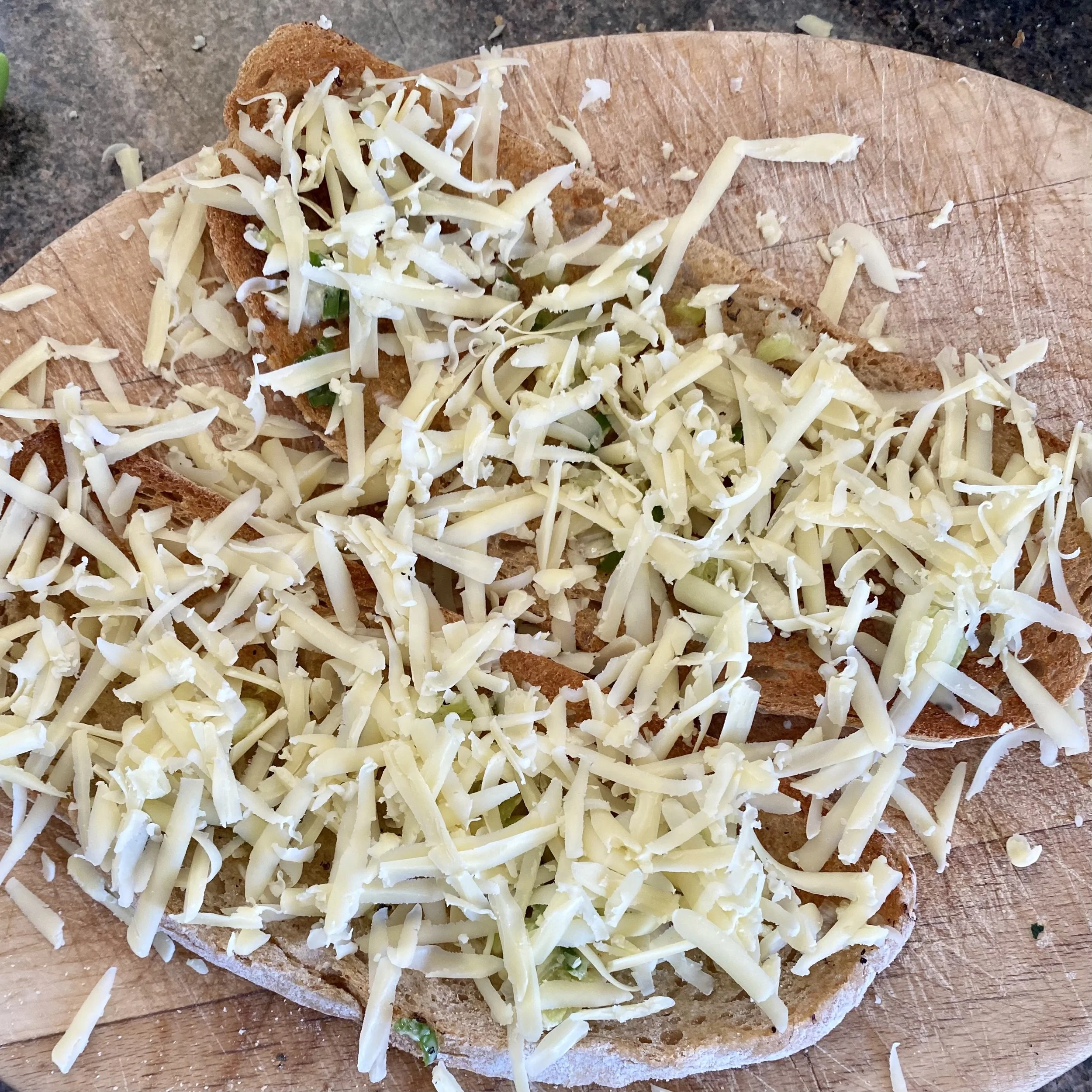 Spread the lightly toasted side with the adorable butter mixture and then grate on the cheese, or add ready-grated cheese (I really am now thinking a mix of cheddar and mozzarella would be amazing).