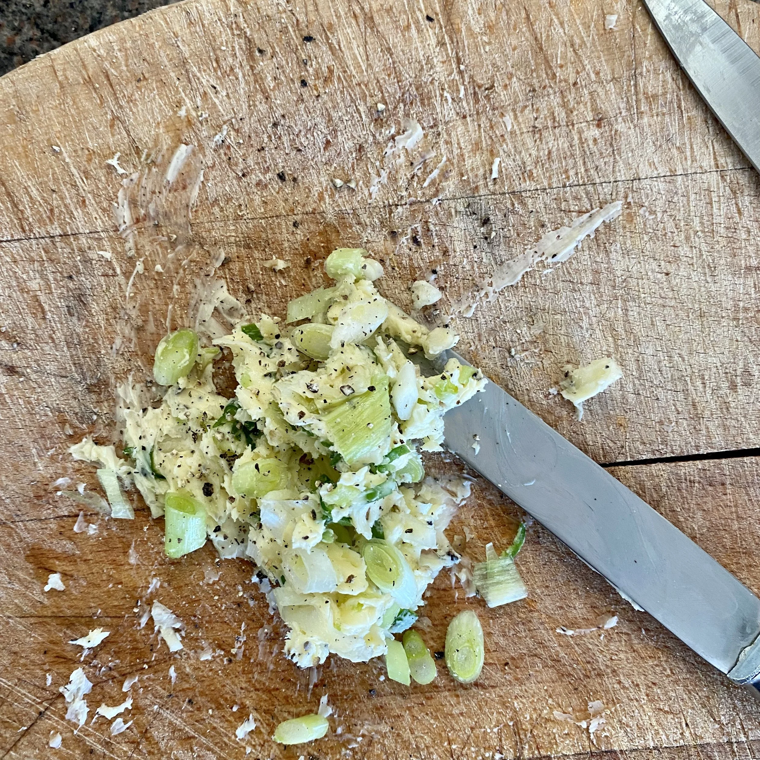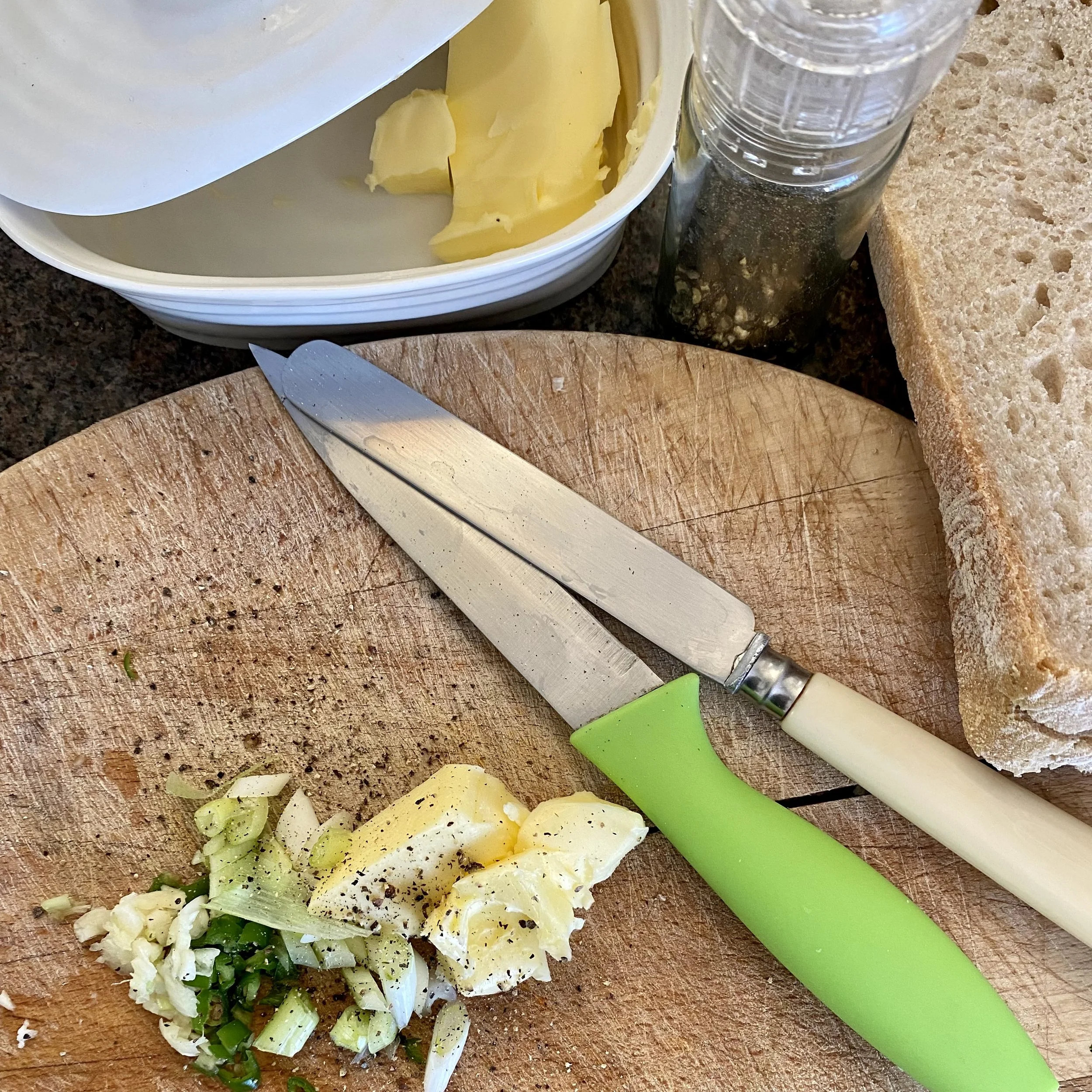 Mash up the butter, spring onions, garlic, chilli and black pepper until you have just the most adorable flavoured butter.