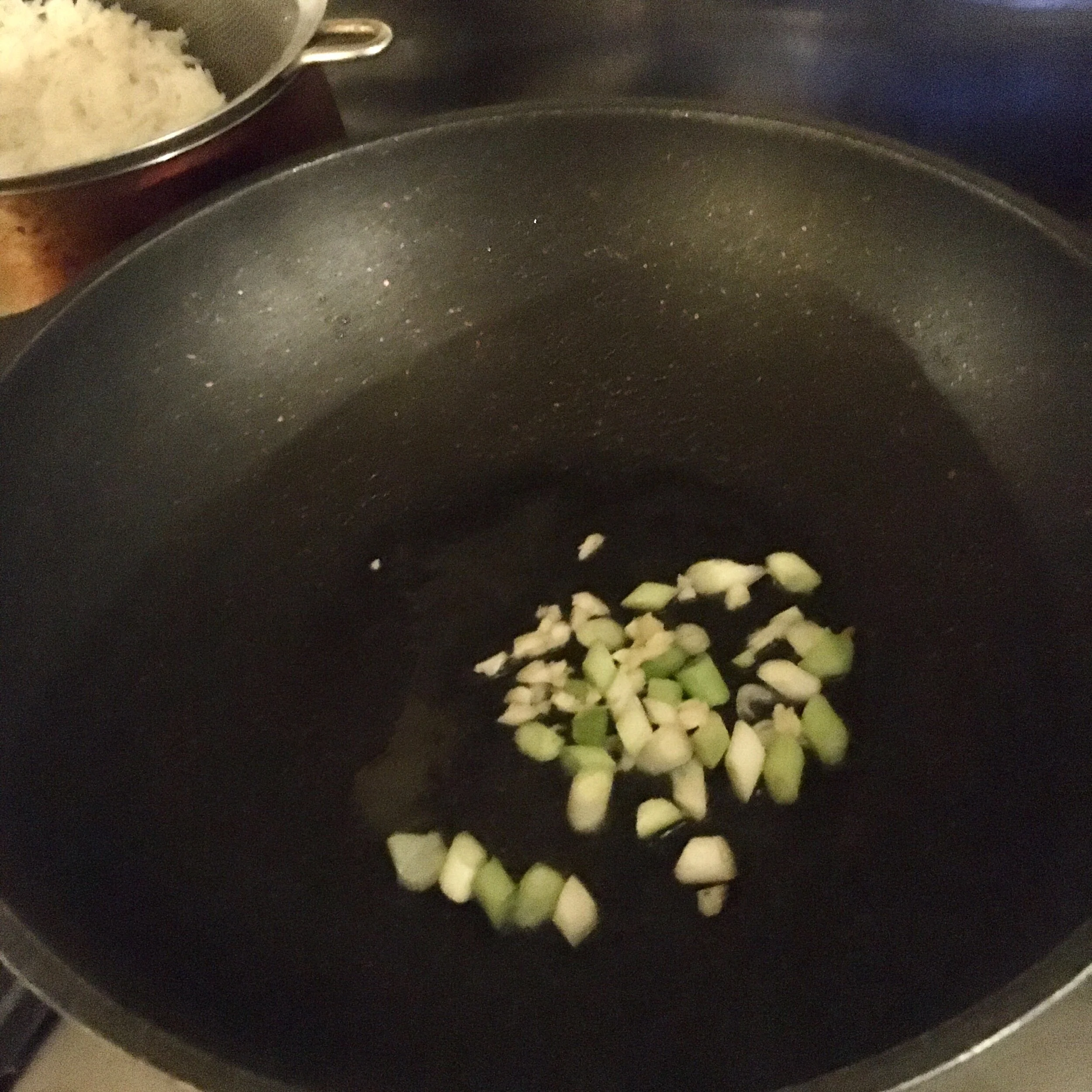 Put a big pan over a medium heat with a couple of teaspoons of cooking oil - I use about 20 sprays of a coconut oil spray - and cook the spring onions and garlic for a few seconds until sizzling and smelling amazing.