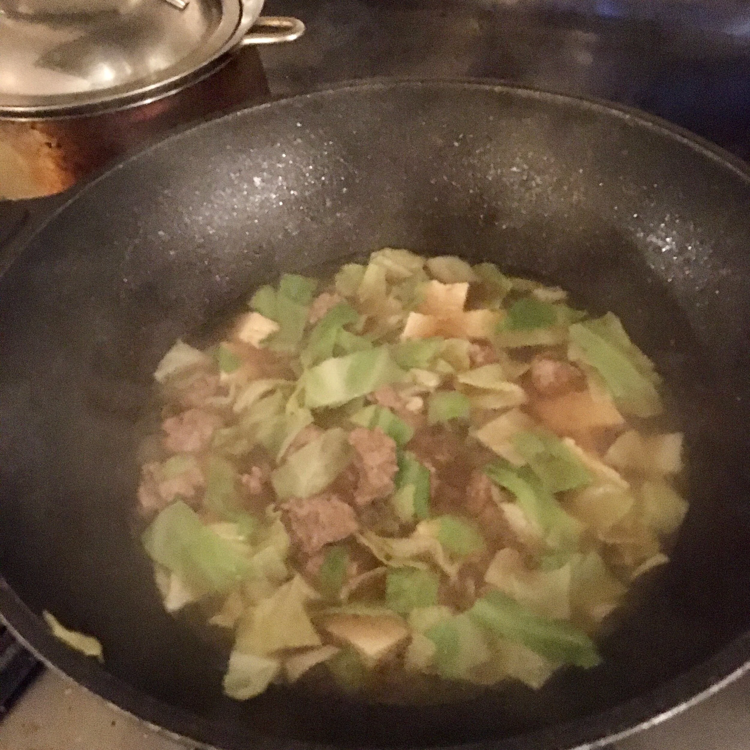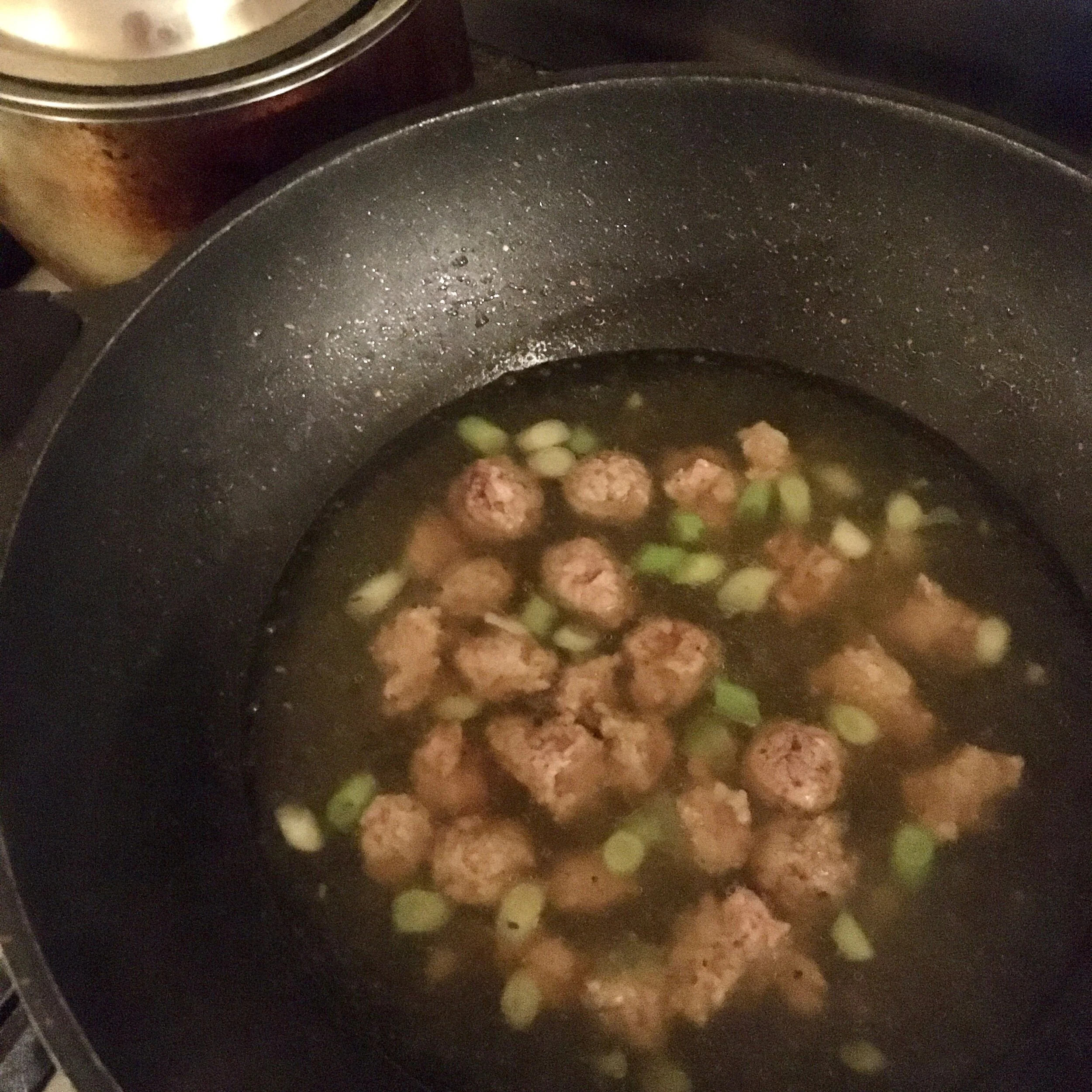 Then just take little pieces of the pork and drop in - you can just drop in as they are or make into little balls if you prefer. Once all the pork is in the water, put a lid on the pan and simmer for 4-5 minutes.