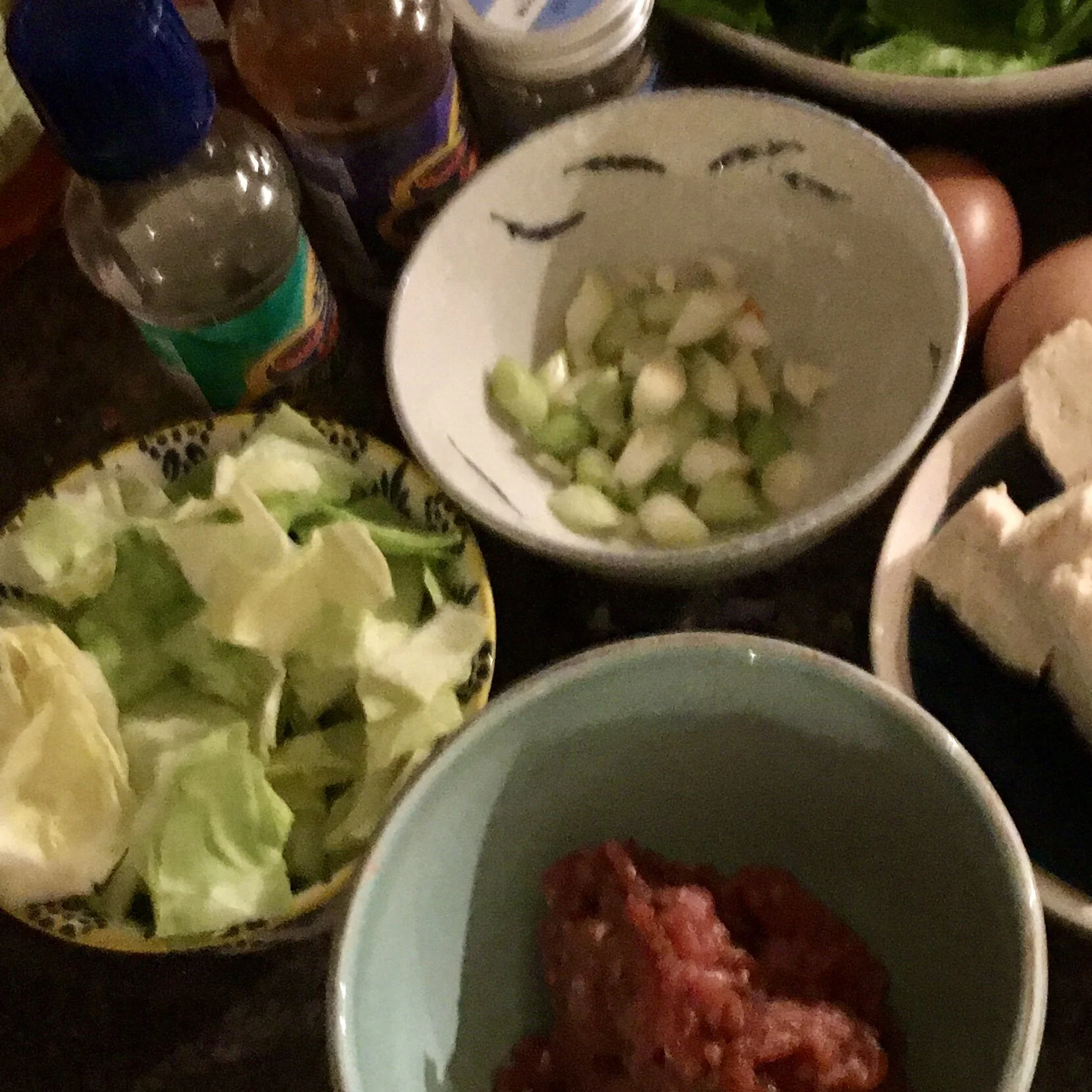 Chop and slice everything and scrunch the pork mince with the white pepper and the soy sauce.