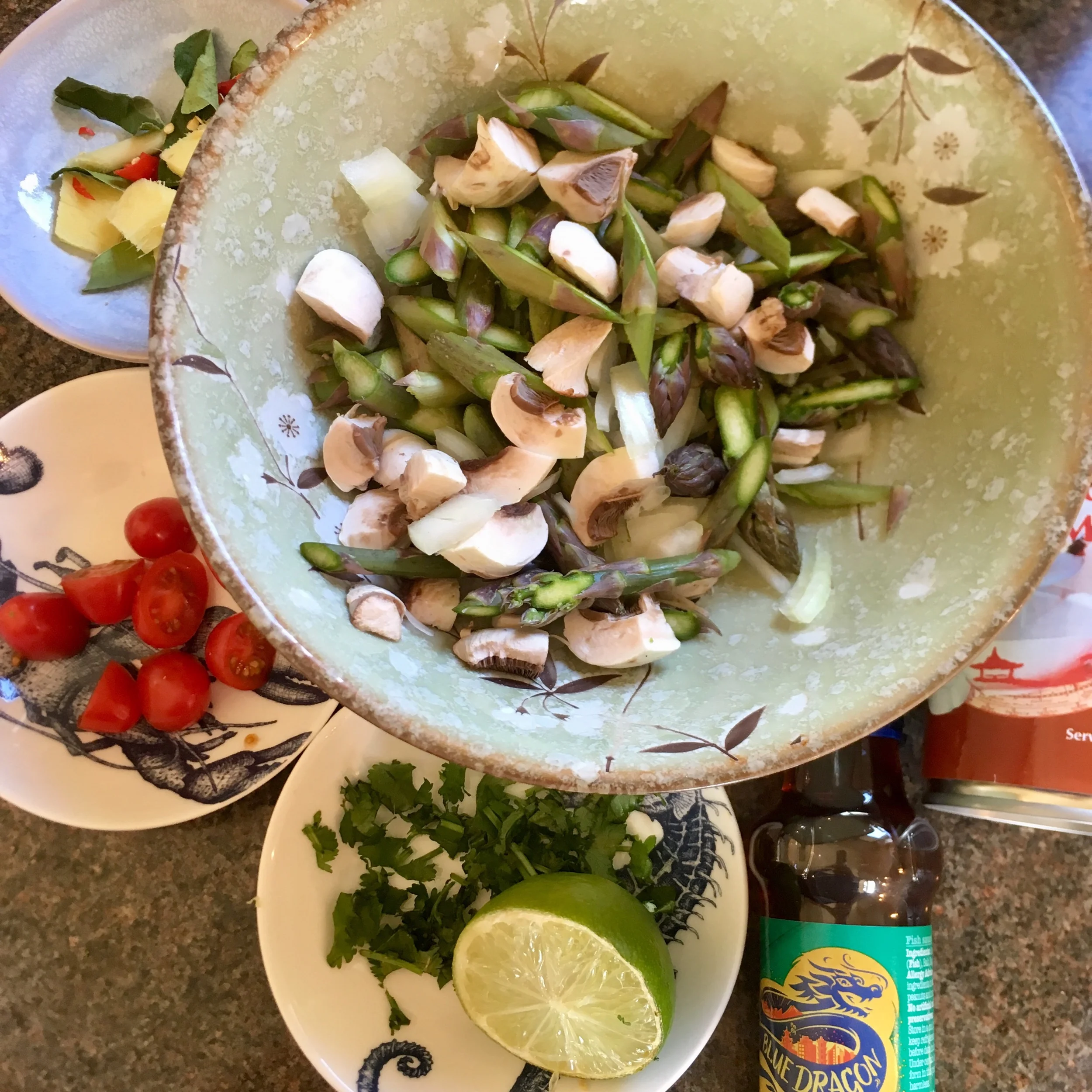 Slice the asparagus spears into smaller lengths and put into a bowl with about a quarter of a white onion and a few mushrooms, washed and chopped.
