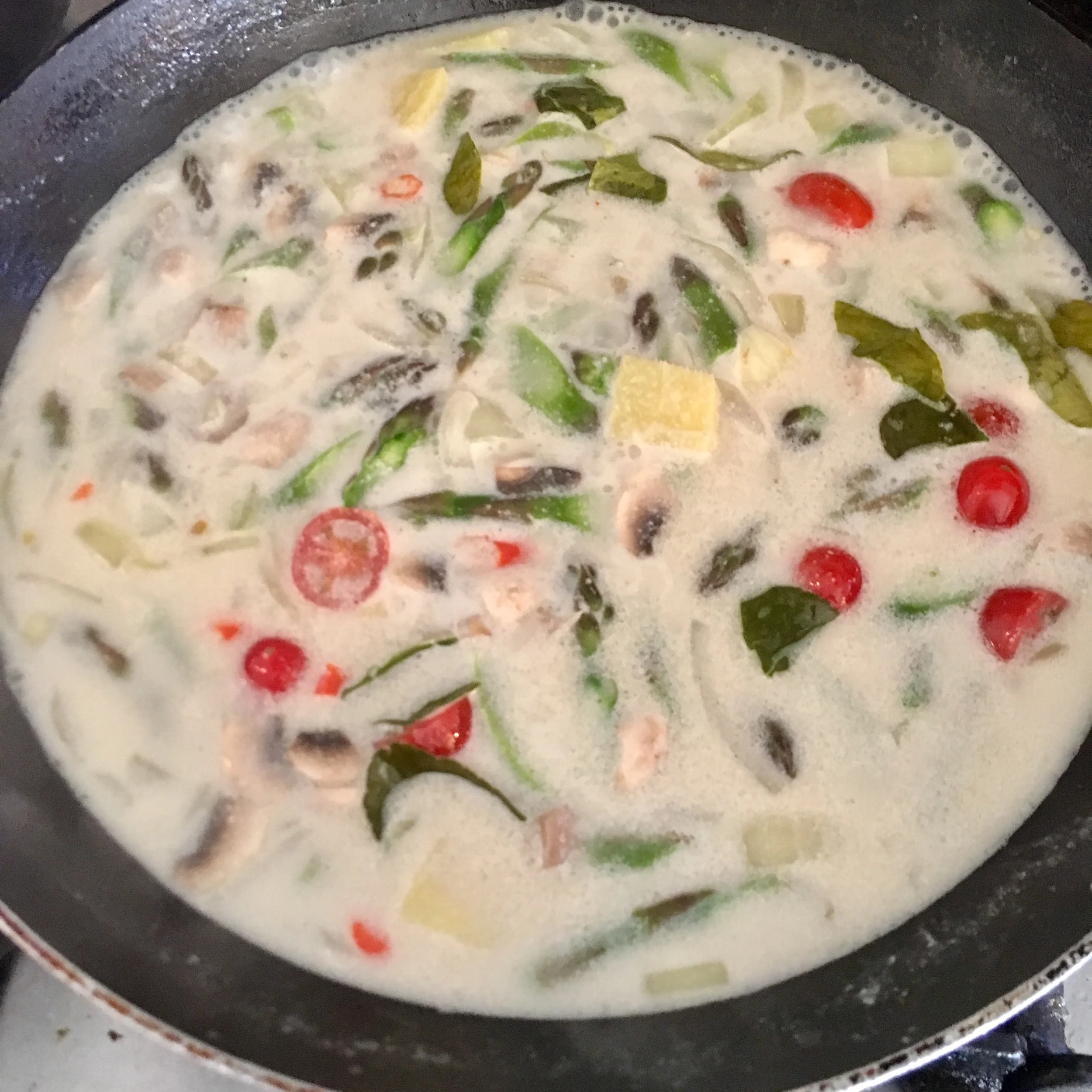 When it’s just about simmering, add the aromatics (the chilli, ginger, lemongrass and lime leaves), stir and again just wait until it comes back to that almost-simmer.