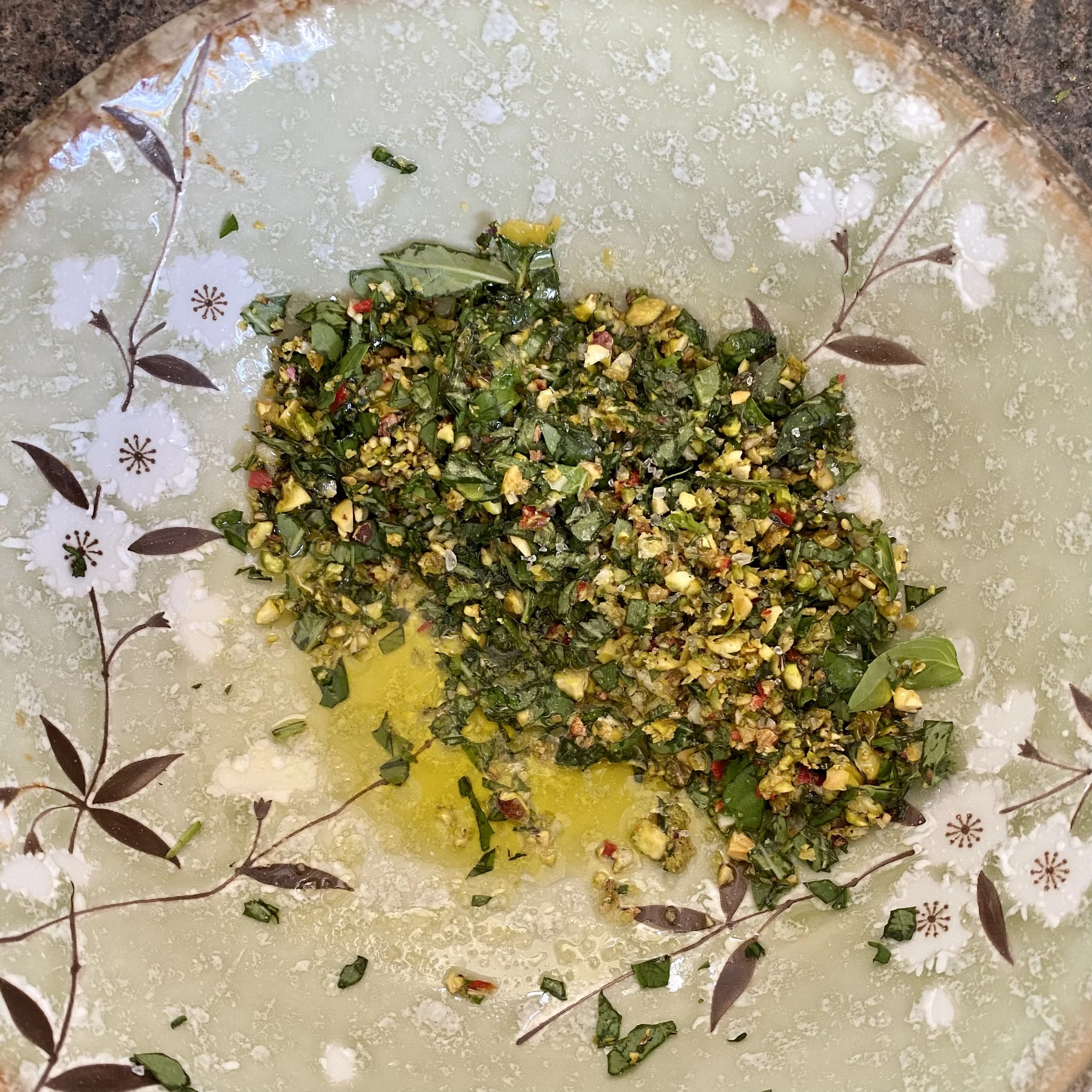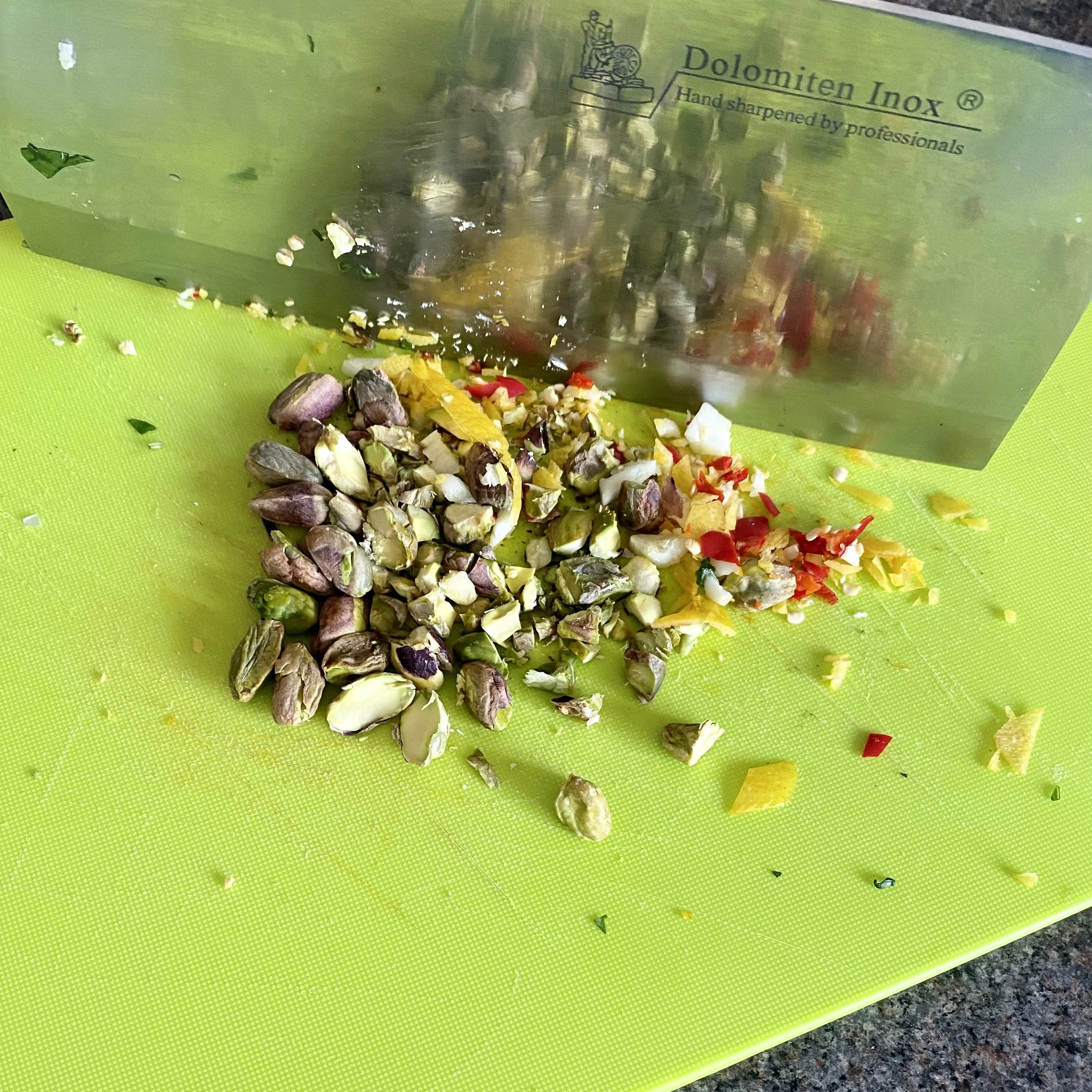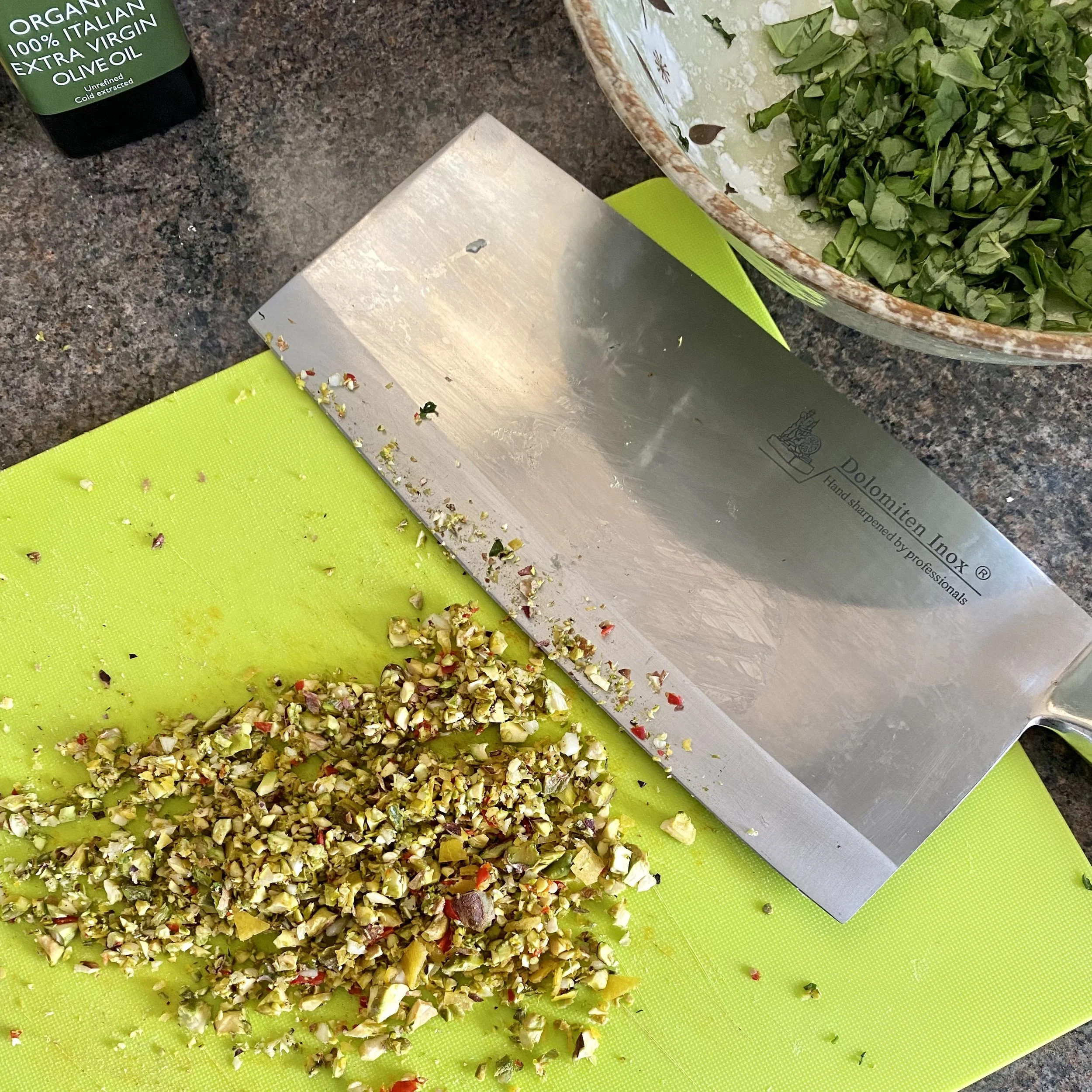 Put the chopped basil into a big bowl or serving dish and then start to finely chop the garlic, pistachios, chilli and lemon zest.