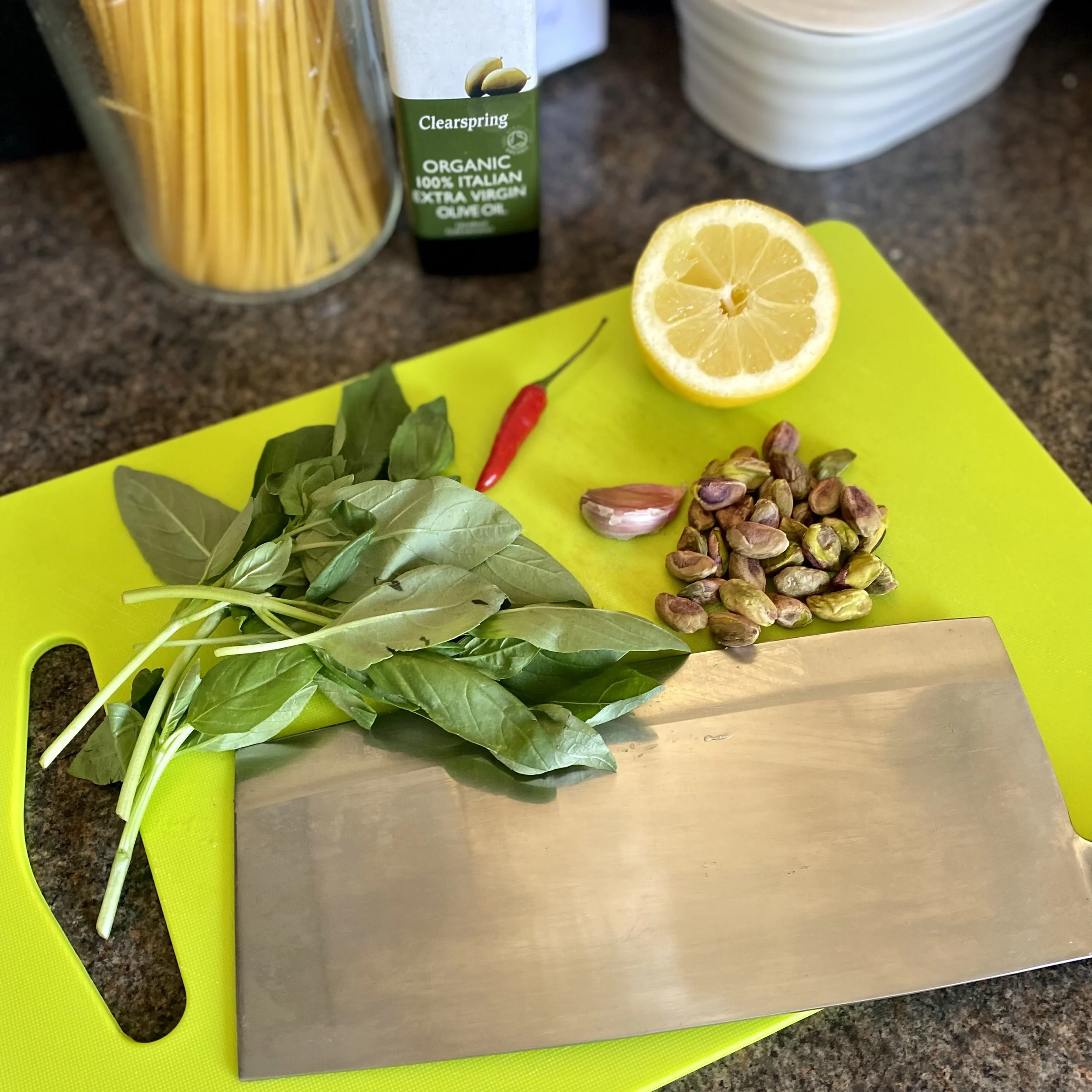While it’s coming to the boil, start making the pesto by first finely chopping the basil. I did this separately to the other chopped ingredients to stop it going mushy.