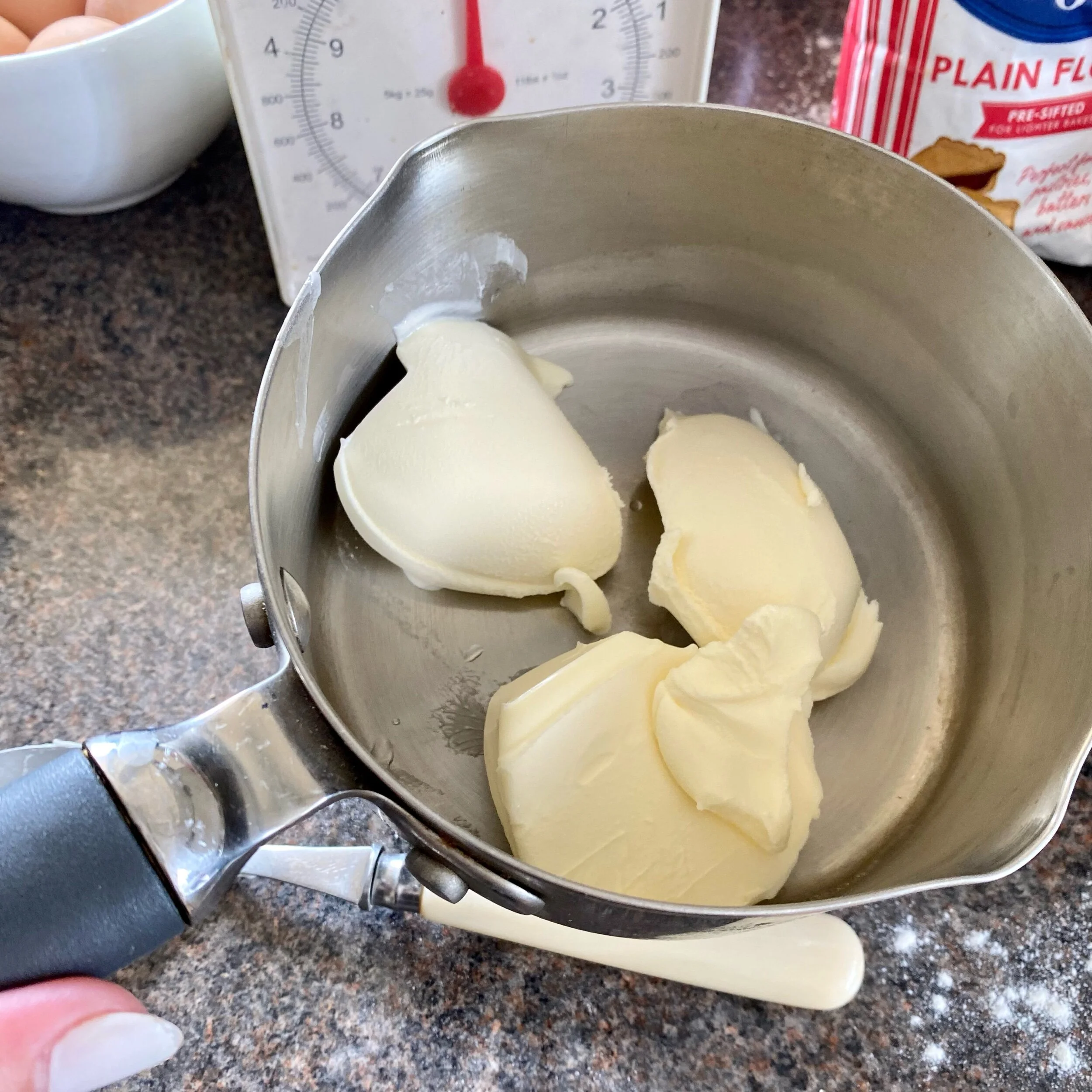 And now to get everything ready and weighed out, with the butter put straight into a little pan over a low heat to melt gently.