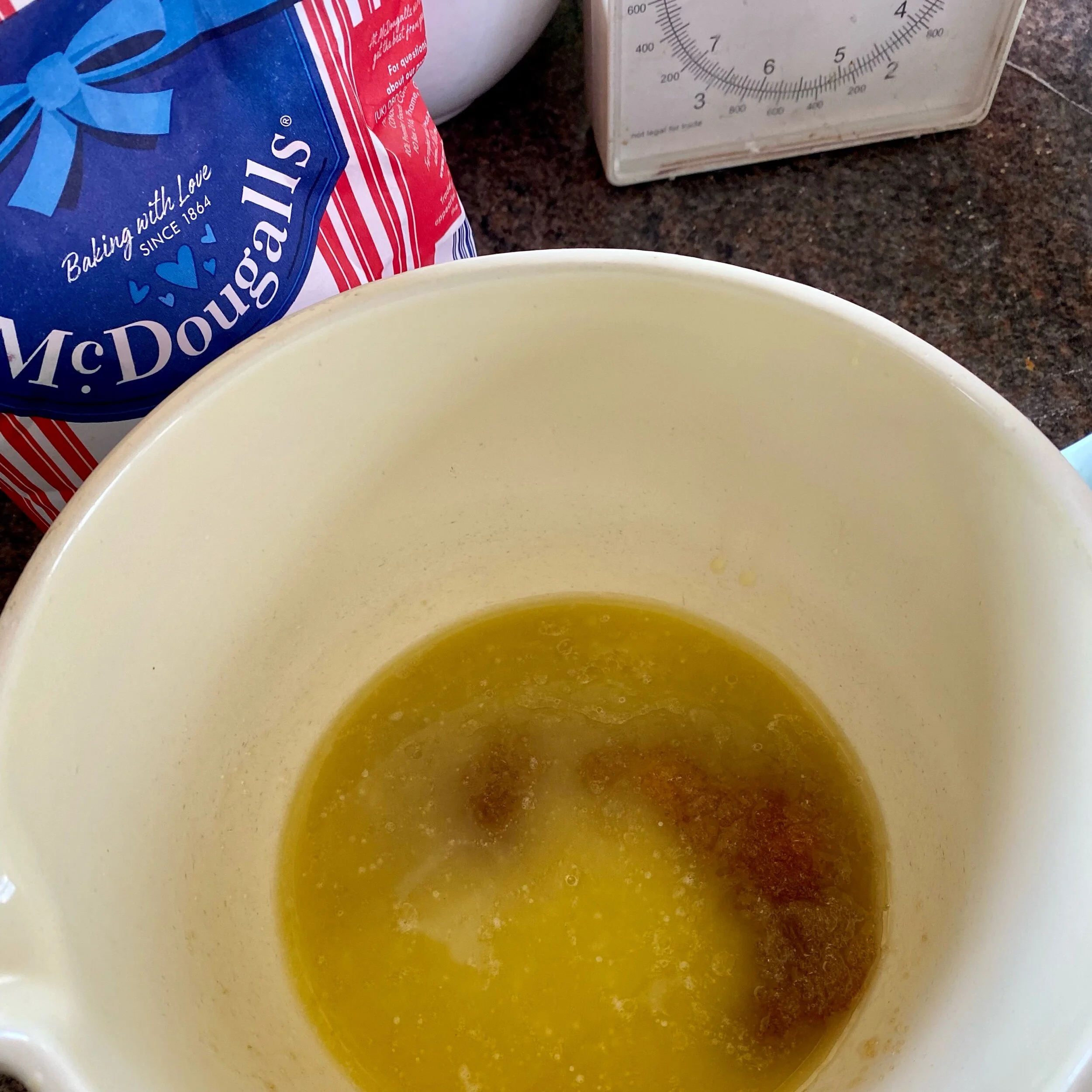 Tip the sugar into a big mixing bowl and pour in the melted butter and stir until it’s all combined.