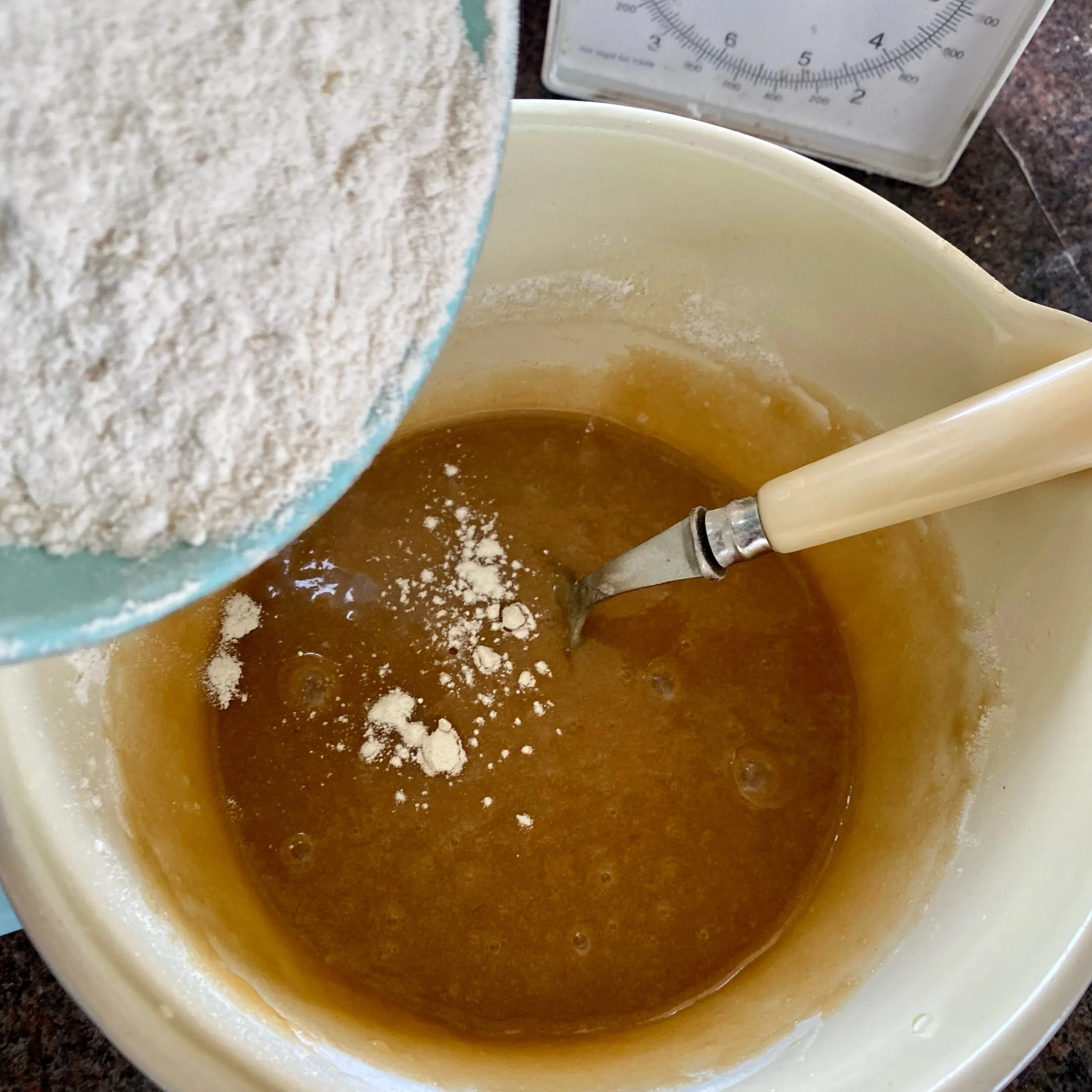 Tip in the flour a bit at a time and stir until mixed before adding some more. Continue until all the flour is completely mixed in and you have a lovely sort of batter.