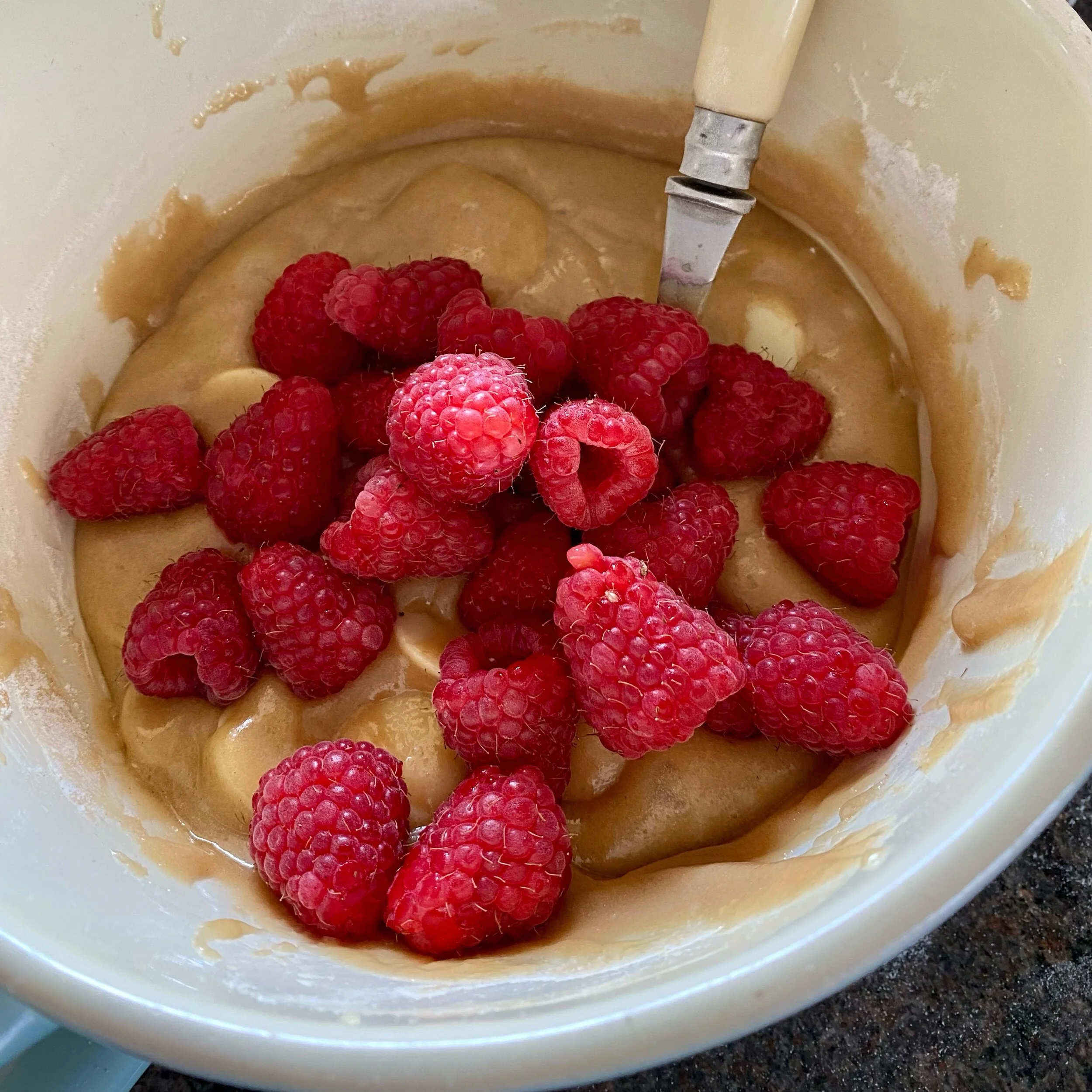 Next stir in the chips or chunks or buttons of white chocolate, and then add the raspberries and stir those in too.
