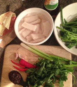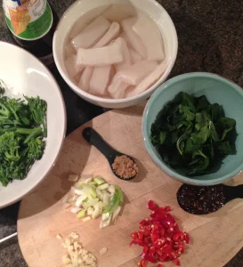 Cook your rice first so that it's ready, as the squid cooks so fast. To save both time and washing up, I just threw some chopped green beans and broccoli in with the rice for the last few minutes' cooking time rather than cooking the veg separately.