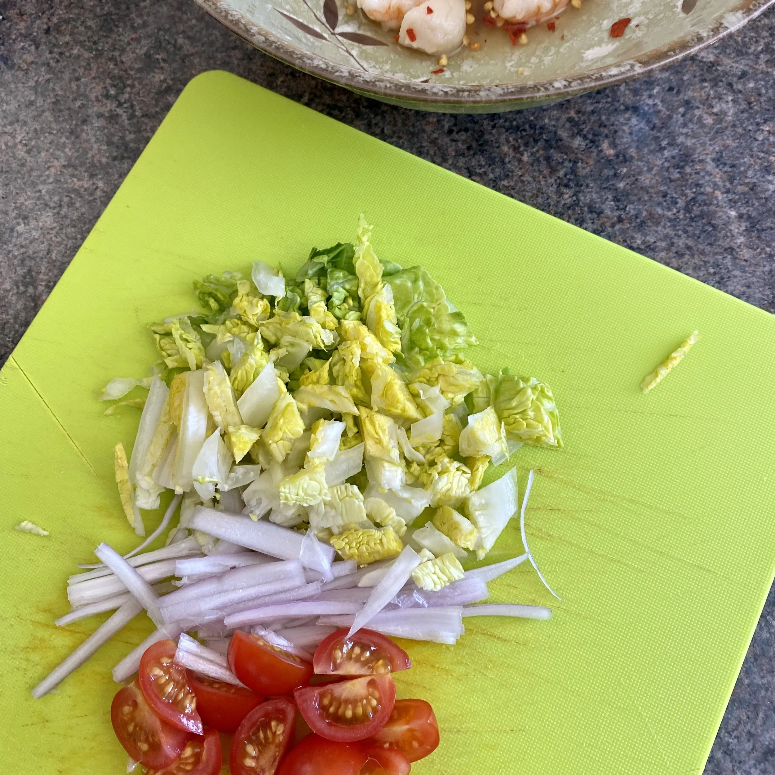 Add the cooked seafood straight into the dressing and then the lettuce, tomatoes and shallots.