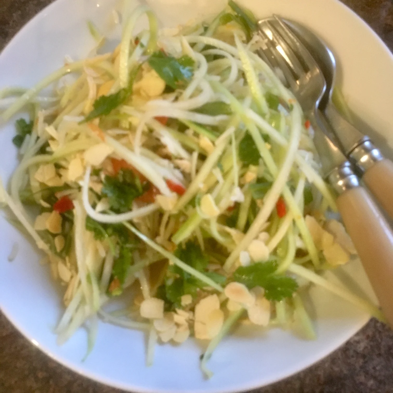 Mix all of the dressing ingredients together (lime juice, fish sauce, sugar, chilli flakes) in a large bowl and stir to dissolve the sugar. Taste and add more of any of the ingredients to make it perfect for you.