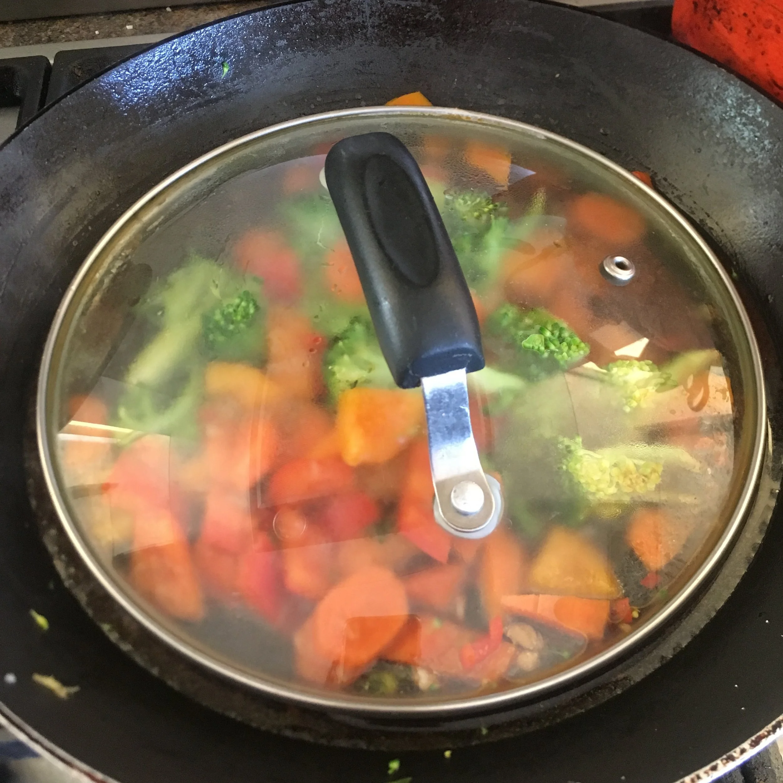 Simmer with a lid on - or mostly on - to retain the water and steam - for three-four minutes (I did four minutes because I had broccoli which takes longer to cook, but without broccoli I’d have given it three minutes).