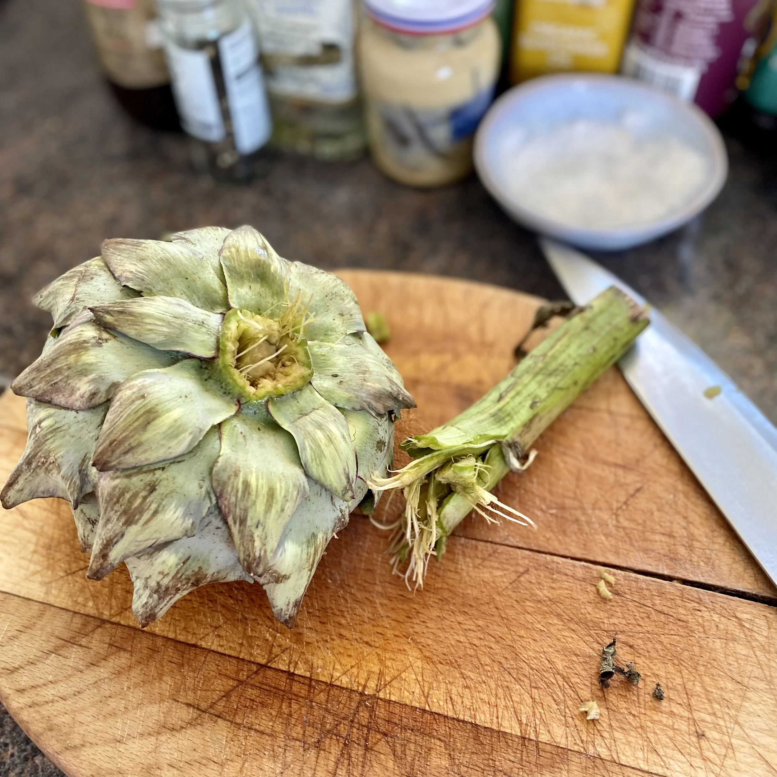 Anyway, however you choose to take off the stalk, just neaten it up with a knife so that your artichoke stands tall and stable on its own, upright on a plate.