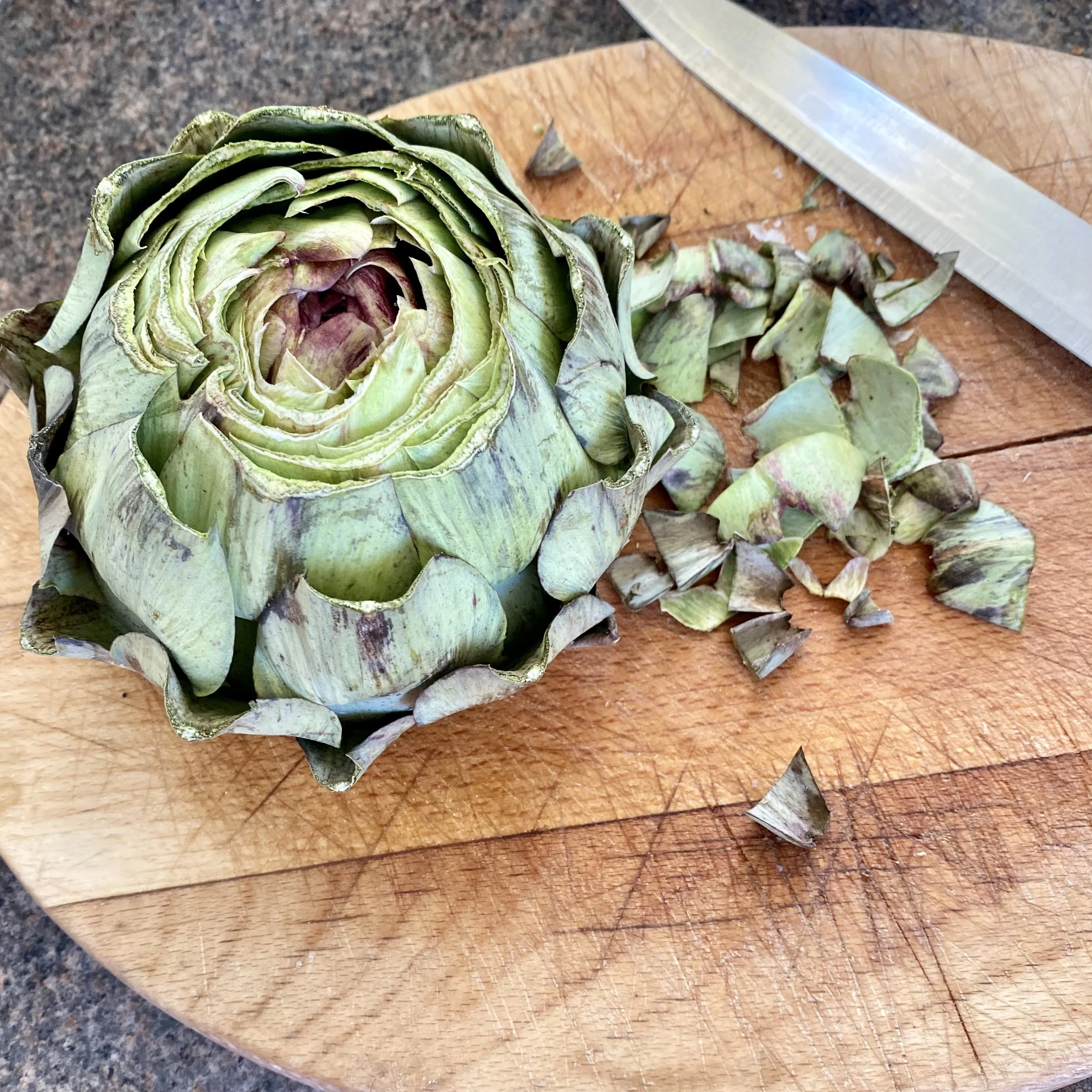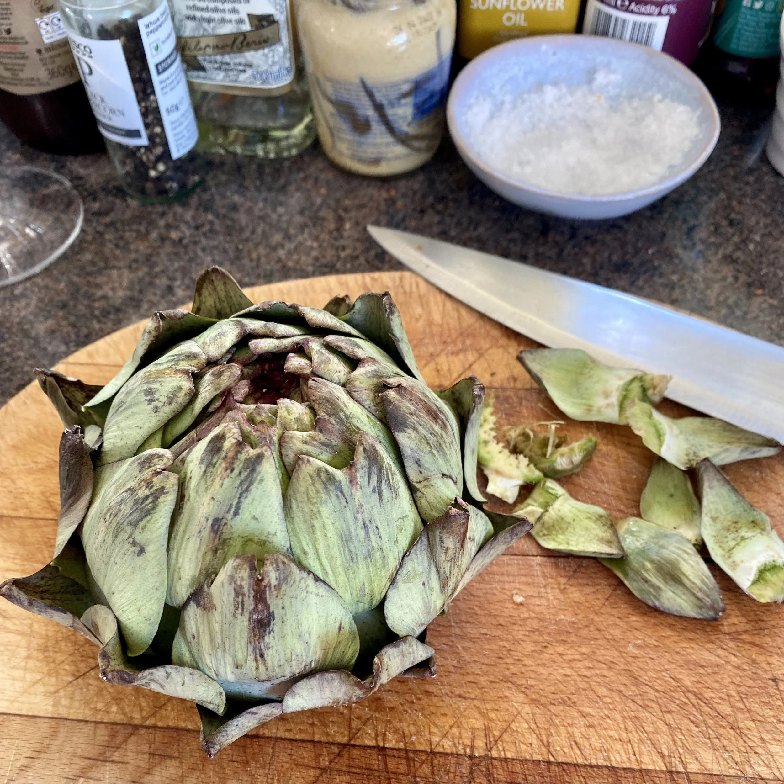 If you have a lemon, I liked this idea (from Julia) to rub lemon juice over all the cut parts of the artichoke.